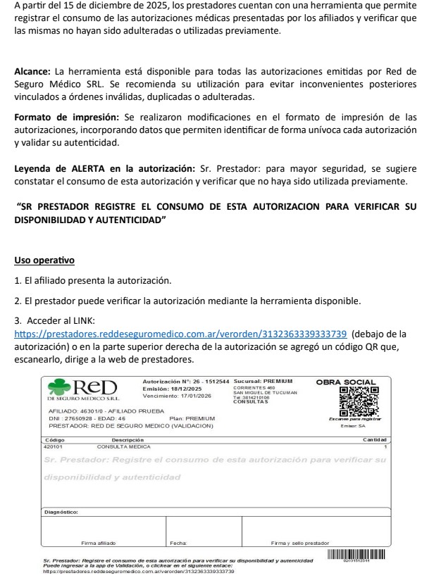 - Todos los afiliados deberán ser validados a través del validador on line. El código obtenido podrá imprimirse o copiar en la planilla de facturación.